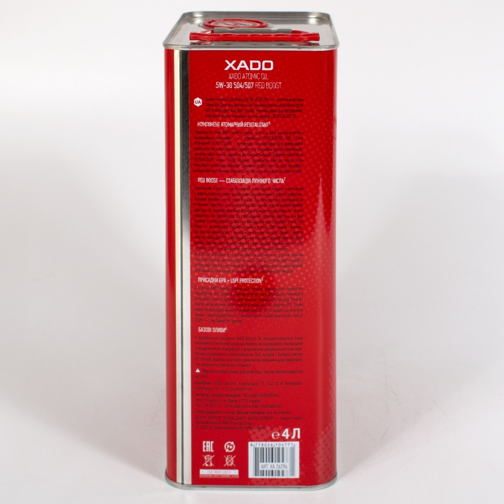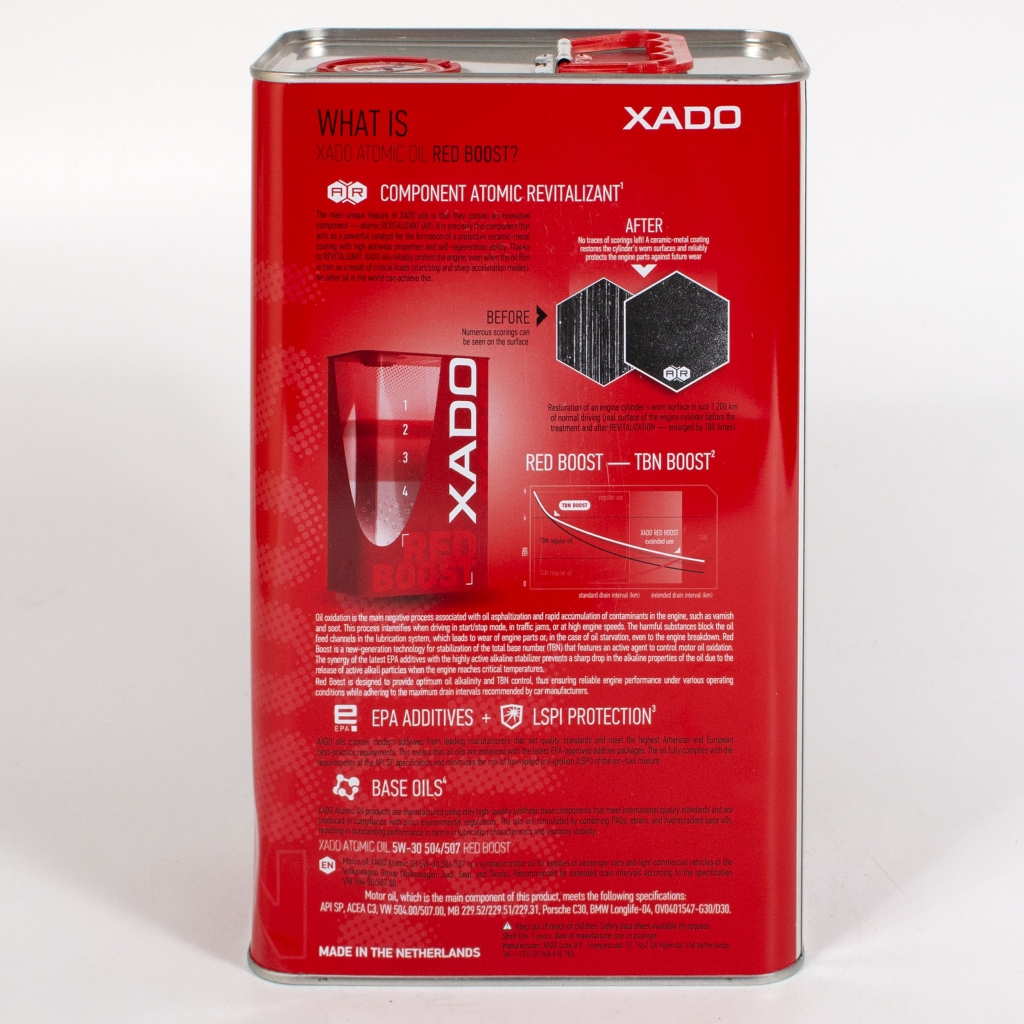 Xado Atomic Oil 5w30 504/507 Red Boost — топливоэкономичное моторное масло с длительным сроком службы для применения в бензиновых, газовых и дизельных двигателях легковых автомобилей и легких коммерческих автомобилей, оборудованных сажевыми фильтрами и/или с 3-ступенчатыми катализаторами последнего поколения.
