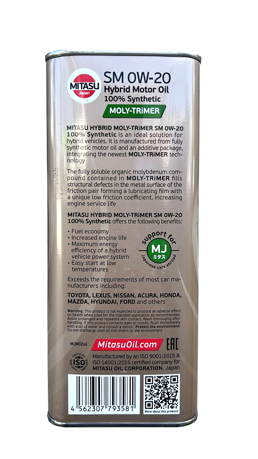 MITASU HYBRID MOLY-TRiMER SM 0W-20 100% Synthetic – полностью синтетическое энергосберегающее моторное масло, изготовленное с применением пакета присадок, произведенного по новейшей технологии «MOLY-TRiMER». Полностью растворимые соединения органического молибдена, входящие в состав пакета «MOLY-TRiMER», способствуют заполнению структурных дефектов поверхностного слоя металла трущихся поверхностей, образуя сверхтонкую смазывающую пленку, обладающую низким коэффициентом трения.