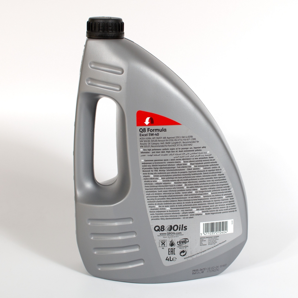 Q8 Formula Excel 5W-40 - универсальное синтетическое моторное масло с высоким показателем сульфатной зольности (High SAPS) для легковых автомобилей и малотоннажных коммерческих автомобилей. Этот продукт гарантирует улучшенную защиту двигателя и облегчает пуск при низких температурах. Он препятствует образованию осадка и минимизирует расход масла. Соответствует требованиям ACEA A3/B4.