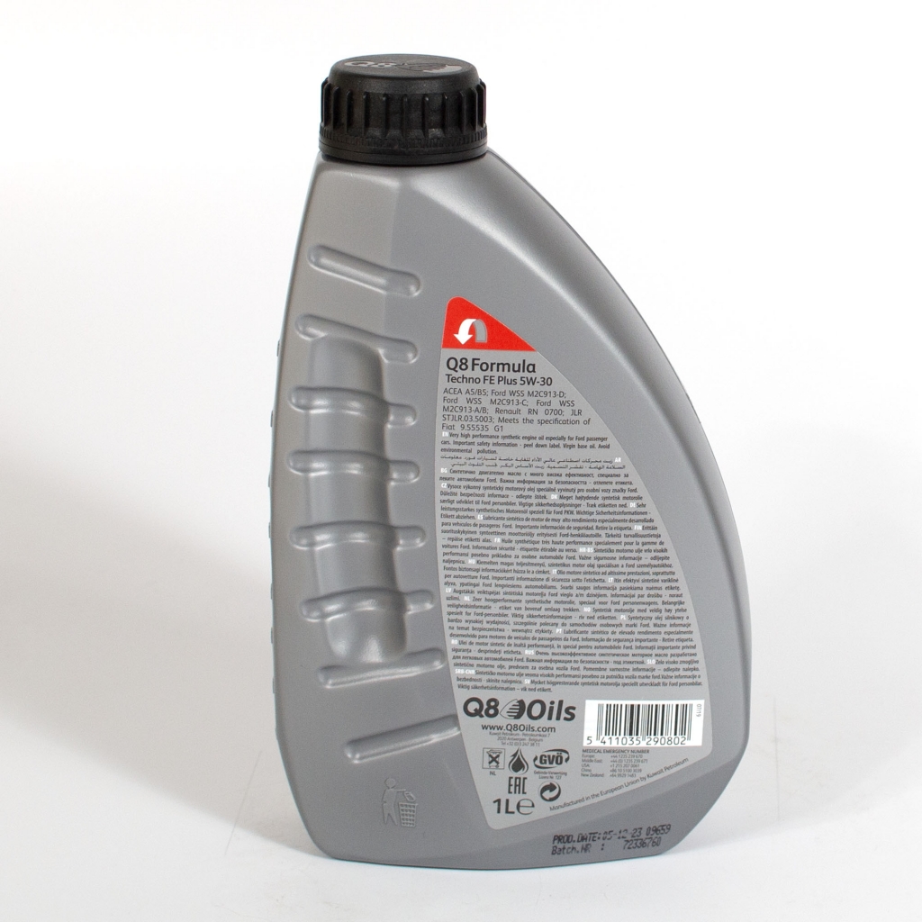 Q8 Formula Techno FE Plus 5W-30 - моторное масло для легковых автомобилей, позволяющее достичь выдающихся характеристик. Также подходит для малотоннажных коммерческих автомобилей. Этот продукт обеспечивает экономию топлива до 2,5% и превосходную защиту от коррозии. Продукт разработан для дизельных и бензиновых двигателей Ford последнего поколения, соответствующих экологическим классам Евро 5 и Евро 6.