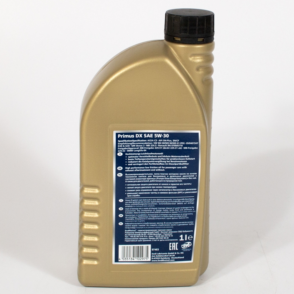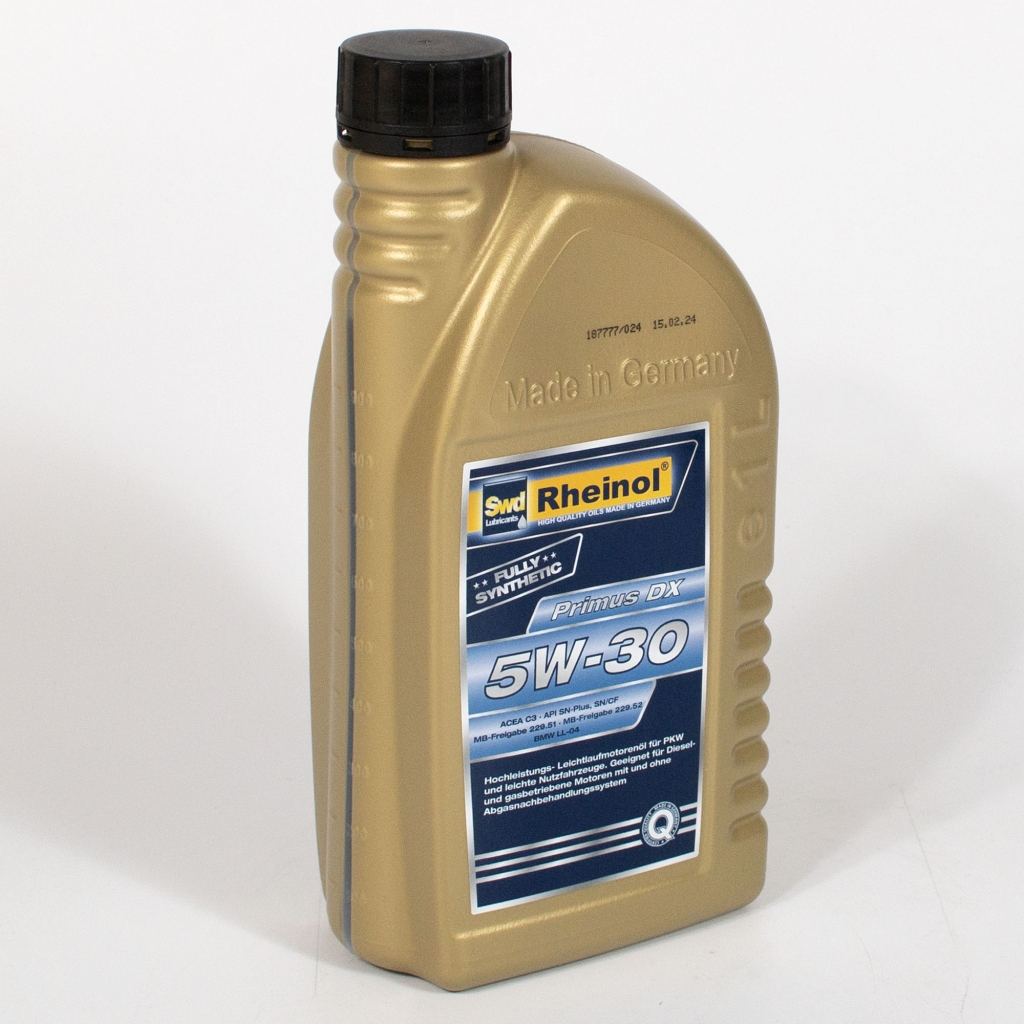 Swd Rheinol Primus DX 5W-30 - высокопроизводительное, легко-текучее моторное масло на основе технологии синтеза для бензиновых и дизельных двигателей с системой инжектора единицы (Pumpe-Düse-Einspritzsystem) и без неё, а также для двигателей, работающих на природном газе.