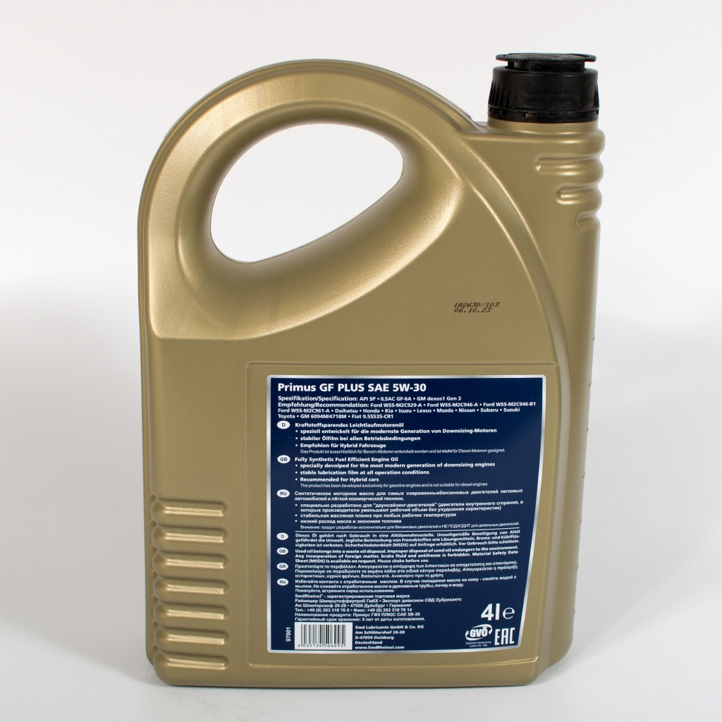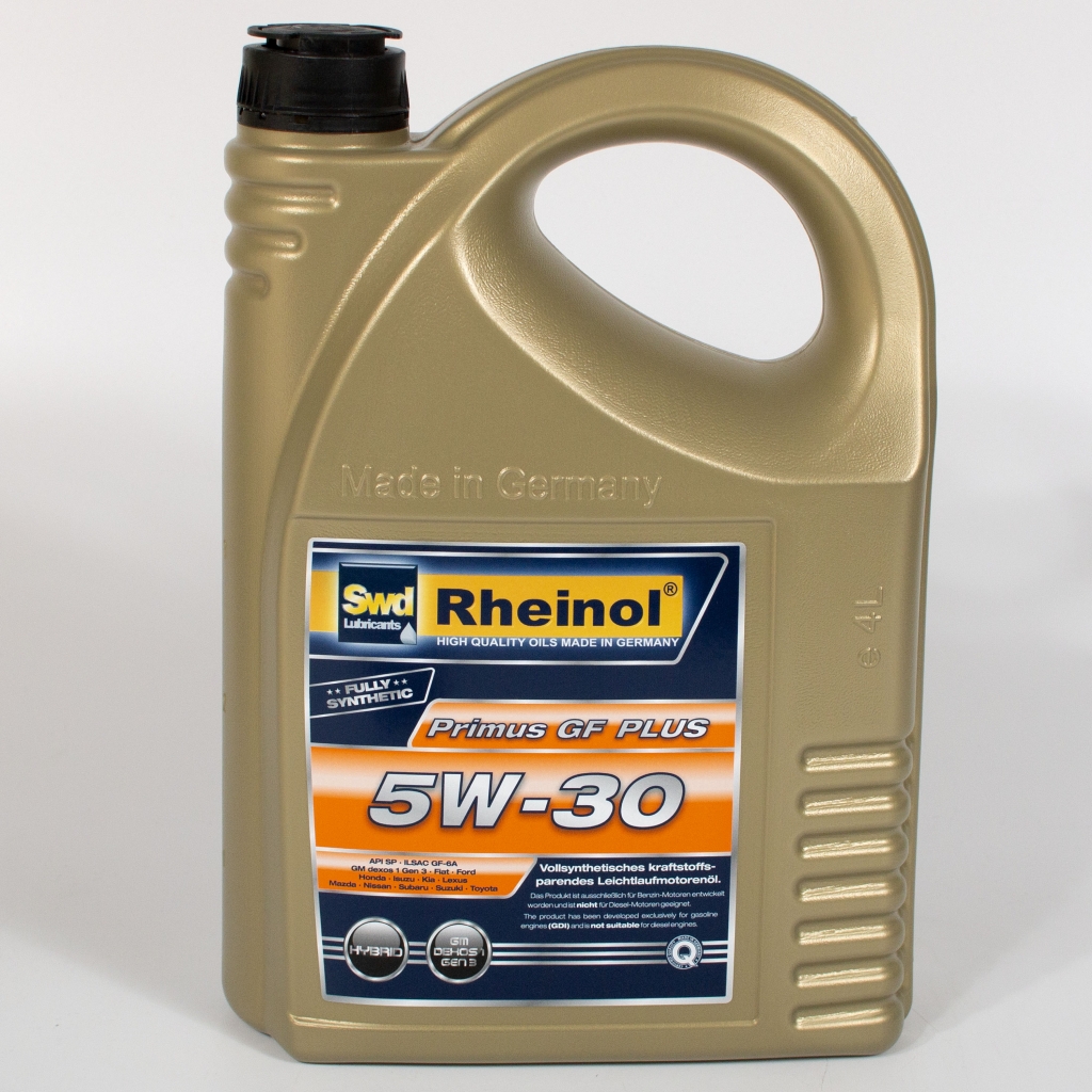Swd Rheinol Primus GF Plus 5W-30 - синтетическое, на основе гидрокрекинга (HC), моторное масло для самых современных бензиновых двигателей легковых автомобилей и лёгкой коммерческой техники. Специально разработано для "даунсайзинг-двигателей" (двигатели внутреннего сгорания, в которых производители уменьшают рабочий объем без ухудшения характеристик). Специальная комбинация базовых масел и присадок предотвращает преждевременное воспламенение смеси в цилиндре (LSPI - Low Speed Pre Ignition).