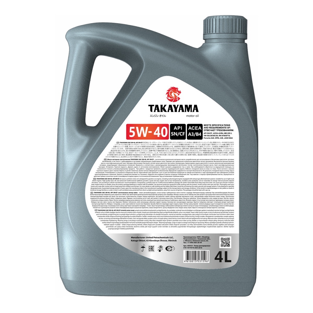 Синтетическое всесезонное моторное масло TAKAYAMA SAE 5W-40 API SN/СF. Разработано для использования в бензиновых двигателях легковых автомобилей, в том числе с турбонаддувом и системами нейтрализации отработавших газов. Подходит для применения в дизельных двигателях легких грузовиков. Высококачественные базовые масла и многофункциональный пакет присадок обеспечивает быстрый и легкий запуск двигателя при низких температурах, превосходную защиту двигателя от износа, увеличенный межсервисный интервал, предотвращает образование отложений. Гарантирует великолепную защиту двигателя даже при экстремальных режимах эксплуатации.
