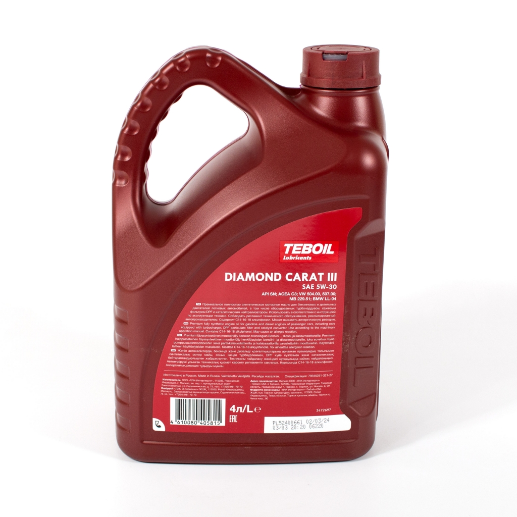 Полностью синтетическое моторное масло с увеличенным интервалом замены для бензиновых и дизельных двигателей легковых автомобилей, в том числе оборудованных турбонаддувом и системами доочистки выхлопных газов (каталитическими нейтрализаторами и фильтрами сажевых частиц). Teboil Diamond Carat III 5W-30 обеспечивает отличную защиту двигателя от износа в жестких условиях эксплуатации, а исключительно стабильный загуститель сохраняет эффективные вязкостно-температурные свойства моторного масла в течение всего срока эксплуатации.